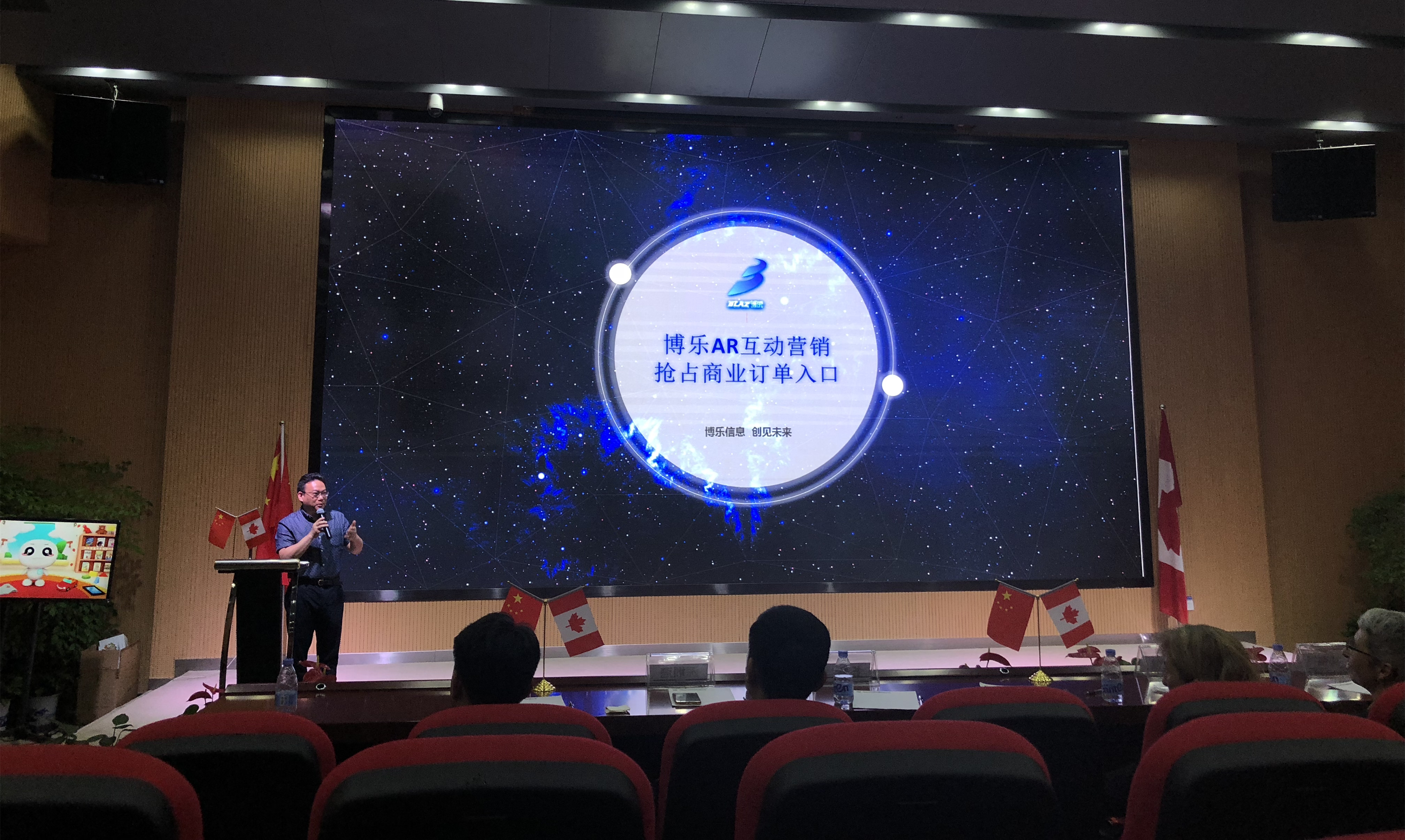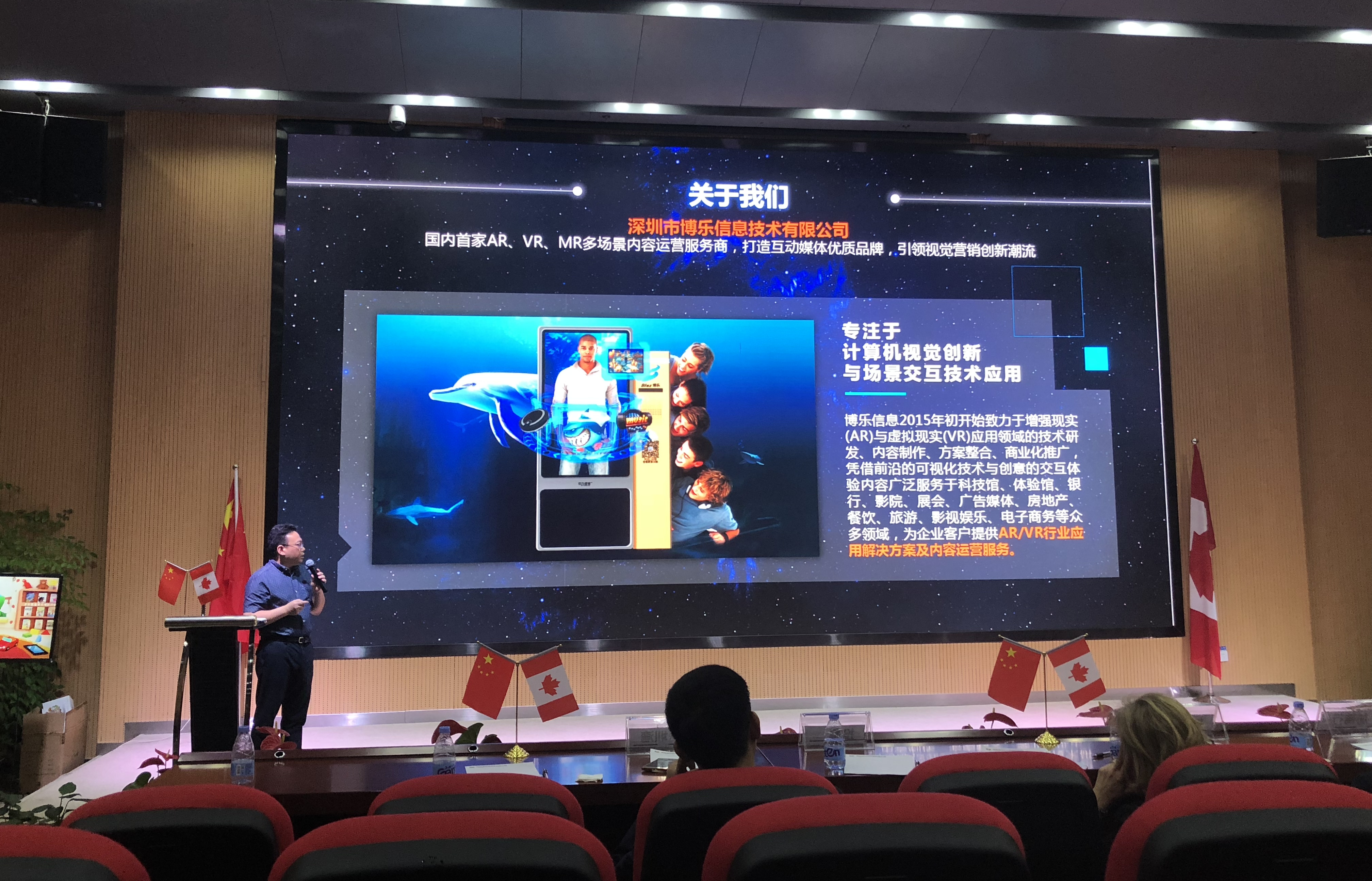 深圳市博乐信息技术有限公司董事长/CEO朱文臻在现场发表主题演讲,从博乐AR互动营销抢占商业订单入口的角度,向远道而来的加拿大嘉宾和中方代表详细介绍博乐AR互动解决方案,获得现场热烈反响。博乐信息是一家专注于计算机视觉创新与场景交互技术应用的高科技公司,凭借前沿的可视化技术与创意的交互体验内容已广泛服务于科技馆、体验馆、银行、影院、展会、广告媒体、房地产、餐饮、旅游、影视娱乐、电子商务等众多领域。