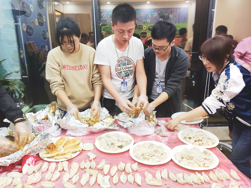 小年夜包饺子一直以来都是博乐信息的传统,我们的程序员和产品小哥哥们是写得了代码,画得好模型,做得出好玩的AR互动,包起饺子来也是毫不含糊,在西北小姐姐的带领下,400个饺子轻轻松松完成。其中今年新研发的“酸菜馅”最受大家喜爱,还有加了香菇、竹荪、木耳、鸡蛋、虾干、干贝、肉酱的三鲜馅,两个字形容简直是高级。除了饺子,升级版韭菜盒子也是一抢而空。