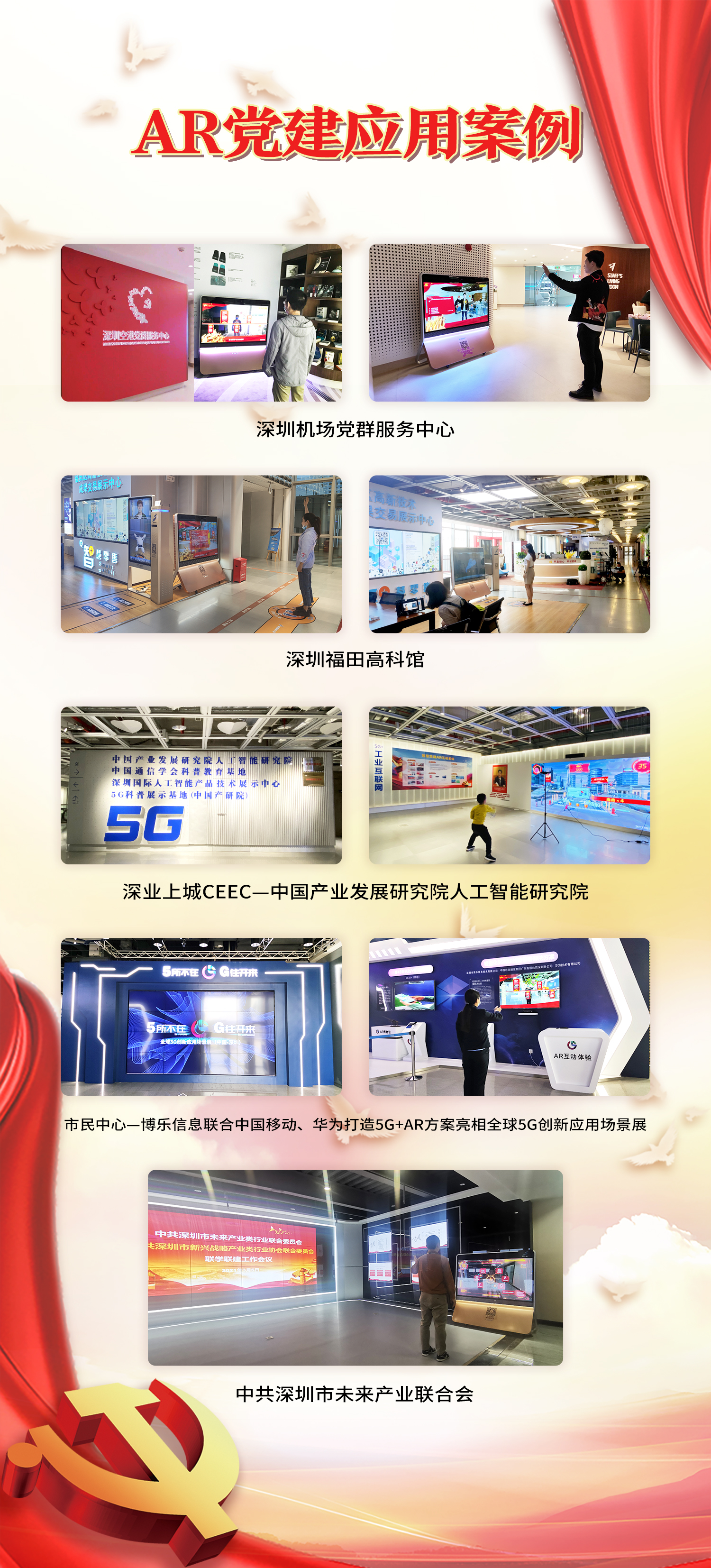 本次活动以“凝思汇智 共谋新局”为主题,深圳市高科技协同创新促进会会长靳晓明、原深圳市市长李子彬、深圳天使基金董事长姚小雄、松禾资本总经理汪洋等嘉宾出席并分享了最新科技、人才、创投的未来发展形势。在活动现场,智慧党建系列深受参观者好评,并表示“将AR科技与党建结合,赋予智慧党建新的生命力,是建党100周年最好的献礼”。