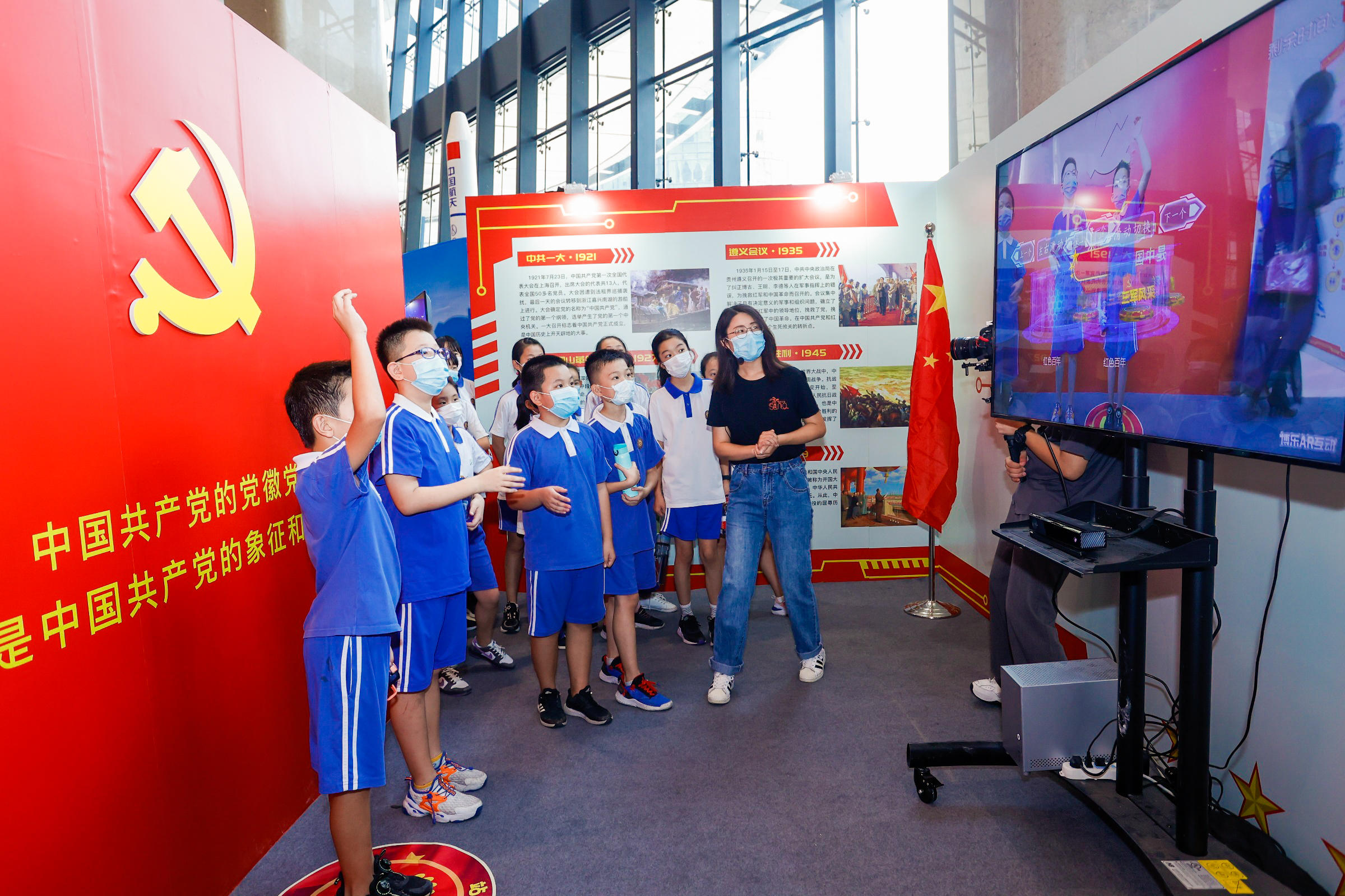 在盒子二《借一缕星光,穿越百年时空》中, 将通过博乐信息红色党史AR互动系统,实现青少年党史科普的交互式、趣味化学习。系统包含《党史100题》《唱响中华》《红色百年》等10余款AR大屏互动内容+小程序AR学四史,应用人脸识别、骨骼追踪等高新技术,创意研发众多互动形式,打造红色党史文化的数字化、虚拟化,可视化、互动化科普,受到现场体验小朋友的热烈喜爱,让红色的种子在青少年心中生根发芽。