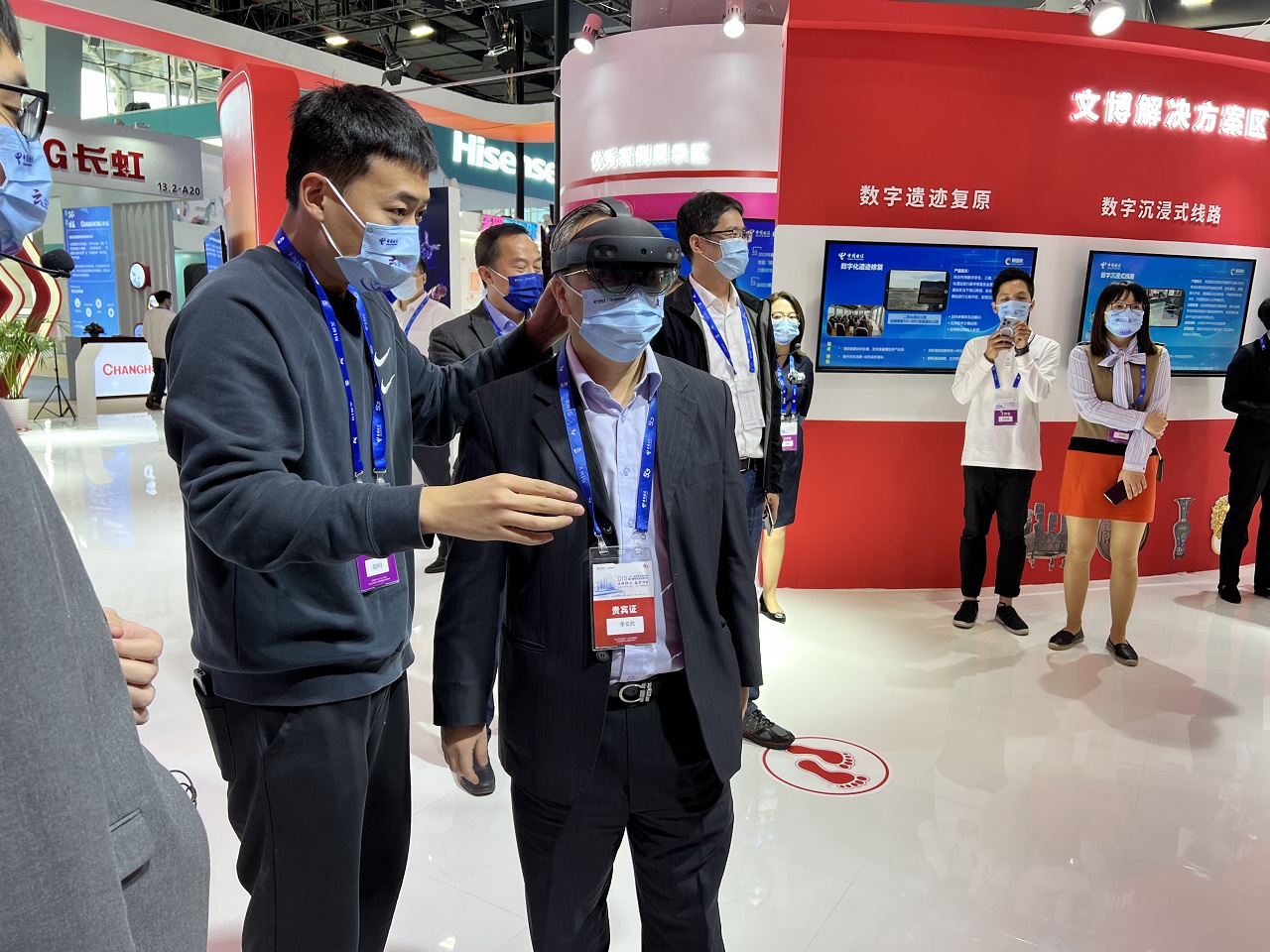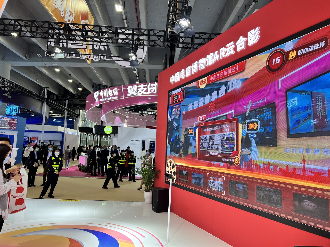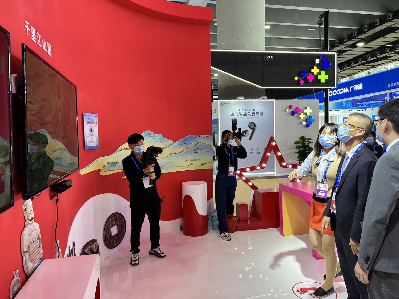 在AR文旅互动区,更有千里江山图、红色通信简史互动体验,基于云网融合,结合3D虚拟分层,打造裸眼3D沉浸式视觉效果。从千里江山图“绿松石3次上色”到“千年不褪色”的秘密,观众可身穿宋徽宗龙袍,游历千里江山图,感受大宋的美好江山。