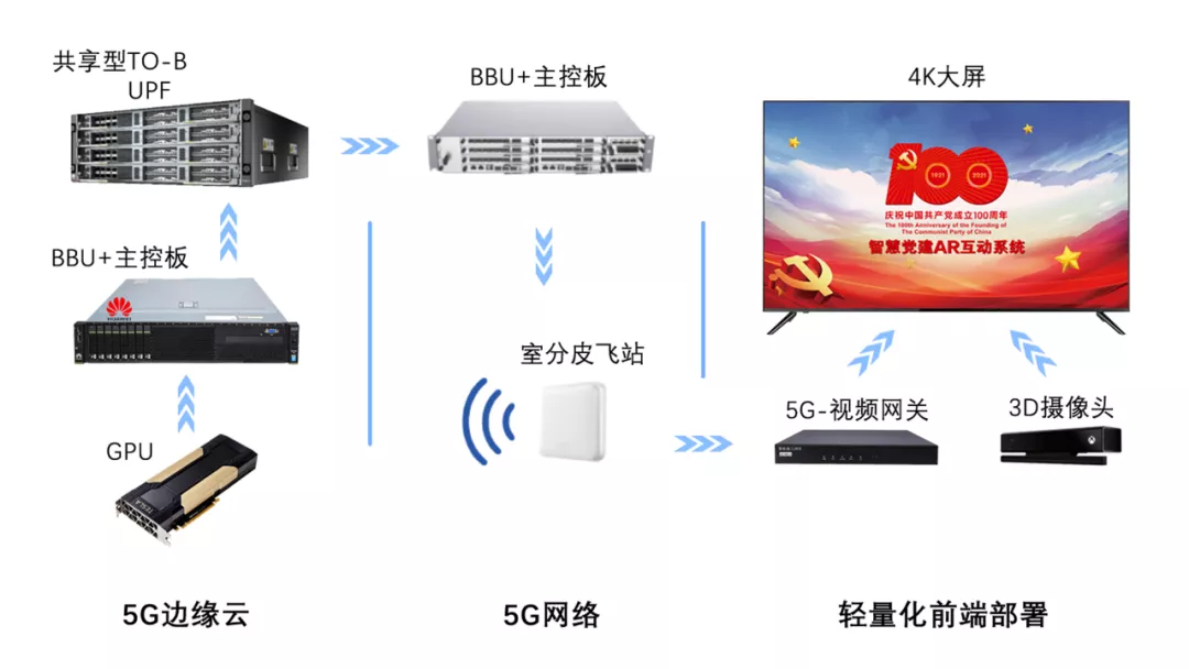 《基于5G-MEC边缘计算的前端轻量化AR党建解决方案》是博乐信息联合深圳市福田区工信局、深圳信息通信研究院、华为、中国移动共同申报,方案基于博乐信息自主研发的智慧党建AR互动系统,利用5G网络超大上行能力+边缘云低时延特性,轻量化前端设计,只保留了3D体感摄像头及具有视频、图形处理能力的5G智能AI网关,连接4K高清大屏,实现AR智慧党建系统在5G网络边缘节点快速部署。