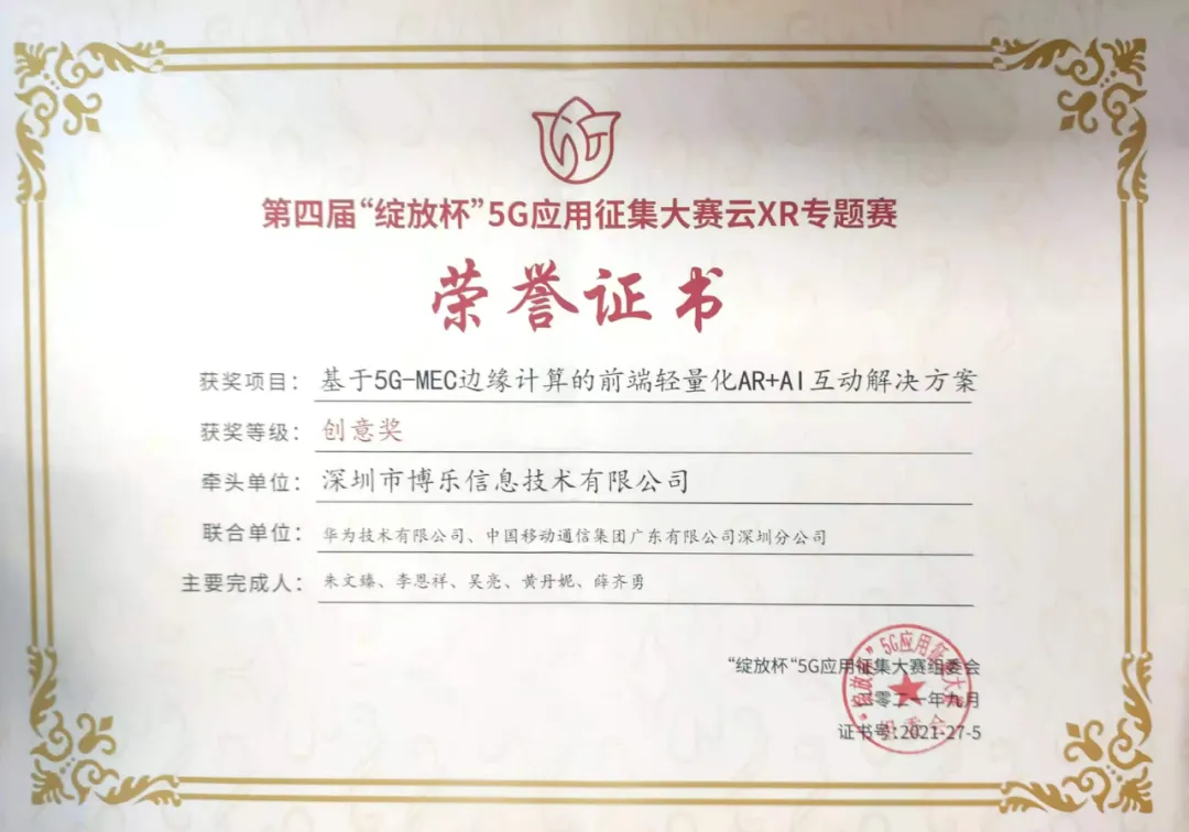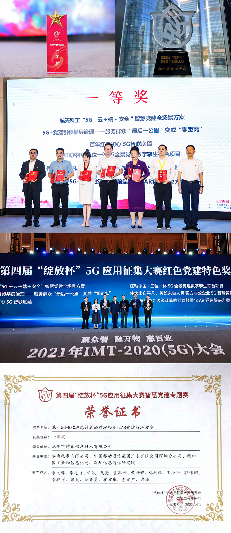 12月6日,由工业和信息化部主办,中国信息通信研究院联合5G应用产业方阵、IMT-2020(5G)推进组、中国通信标准化协会以及金砖国家未来网络研究院中国分院共同承办的第四届“绽放杯”5G应用征集大赛总决赛圆满落幕。经过3个月的申报、4个月激烈的比赛,博乐信息在12281个项目中脱颖而出,斩获第四届“绽放杯”5G应用征集大赛“智慧党建”专题赛一等奖、红色党建特色奖、云XR专题赛创意奖三项大奖。