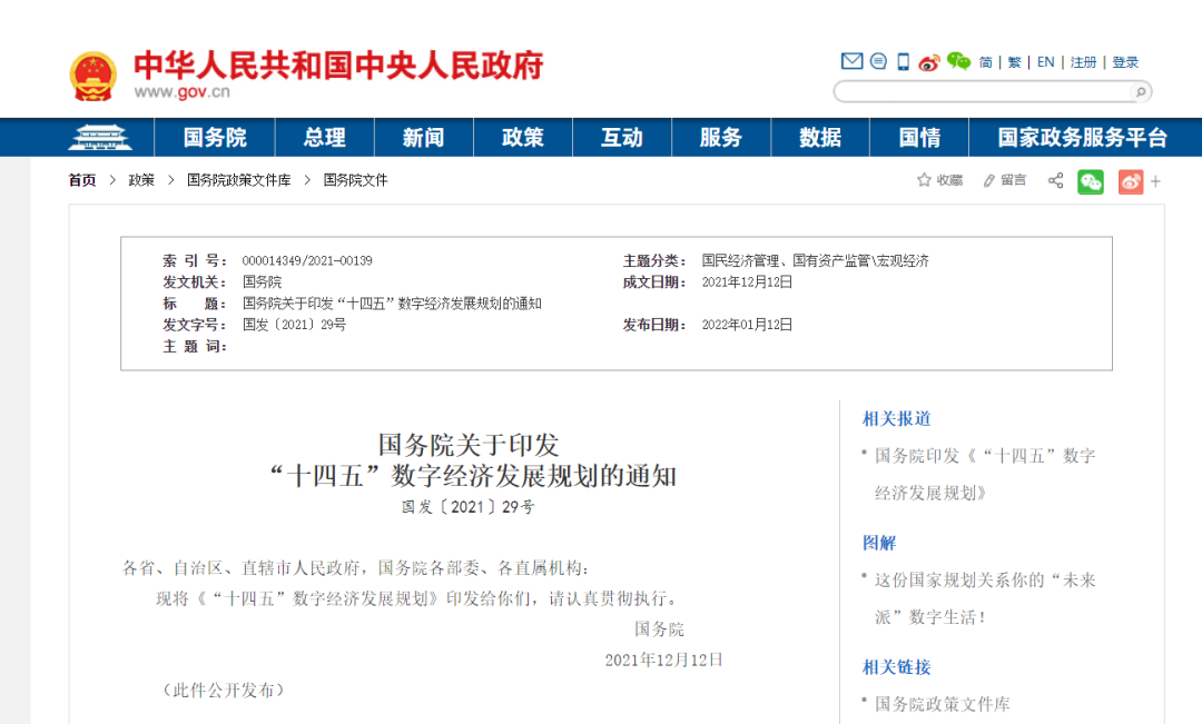国务院印发《“十四五”数字经济发展规划》,提出到2025年,数字经济迈向全面扩展期,数字经济核心产业增加值占GDP比重达到10%。