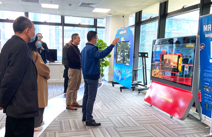 陈书记一行参观考察了博乐信息元宇宙展厅,全方位体验了AR大屏互动、MR视觉交互、手机AR应用等博乐元宇宙数字科技产品。