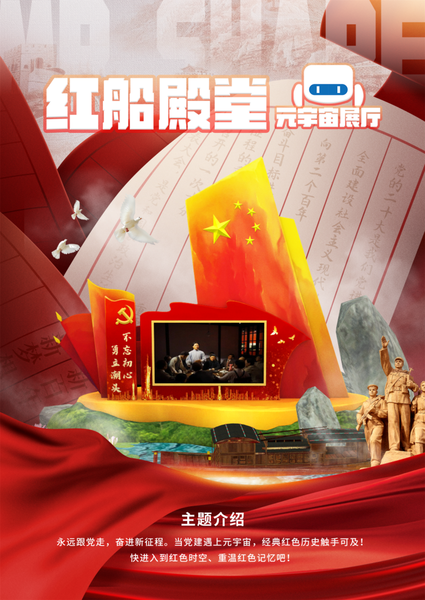 红船殿堂重点打造了体系化的红色文化内容,包含党史学习、重游红色革命旧址、强国教育、警示教育等。从最早的红船精神到长征精神,从新中国成立前的筚路蓝缕到新中国成立后的伟大复兴,有序的将红色文化资源实现创新性的保护和开发,打造丰富的红色文化内容创意数字展现。