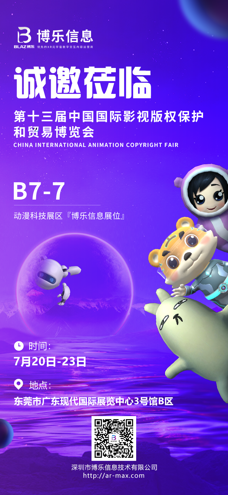 7月20日至23日,博乐信息将携元宇宙最新应用科技,MR Share数字虚拟空间和AR创意互动产品,围绕“数字技术创新”和炫酷视觉呈现,打造“千人百变国潮秀——AR换装”,“MR数字虚拟空间趣味打卡”,还有元宇宙艺术珠宝、创意手机AR小程序等数字交互作品精彩亮相第十三届中国国际动漫博览会。