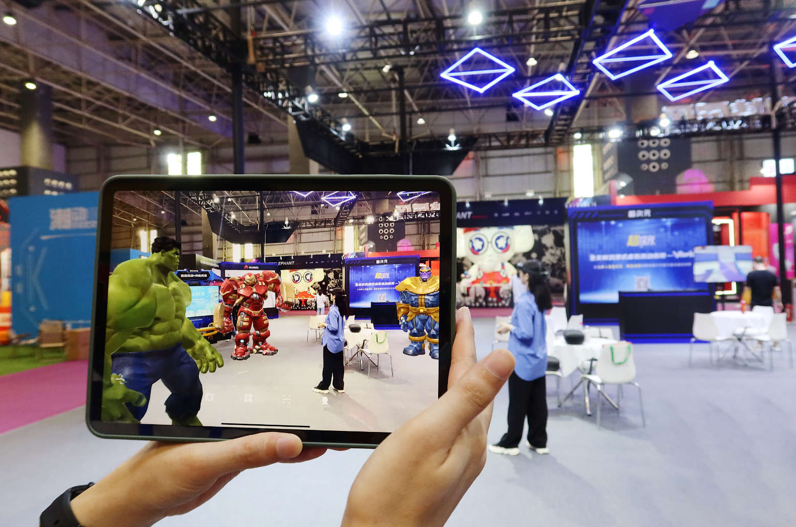 相较于AR大屏互动,展会现场的MR技术更加强调科技感和沉浸感,观众通过佩戴智能眼镜或者使用平板、手机等终端,便可以感受3D数字场景的完美还原。