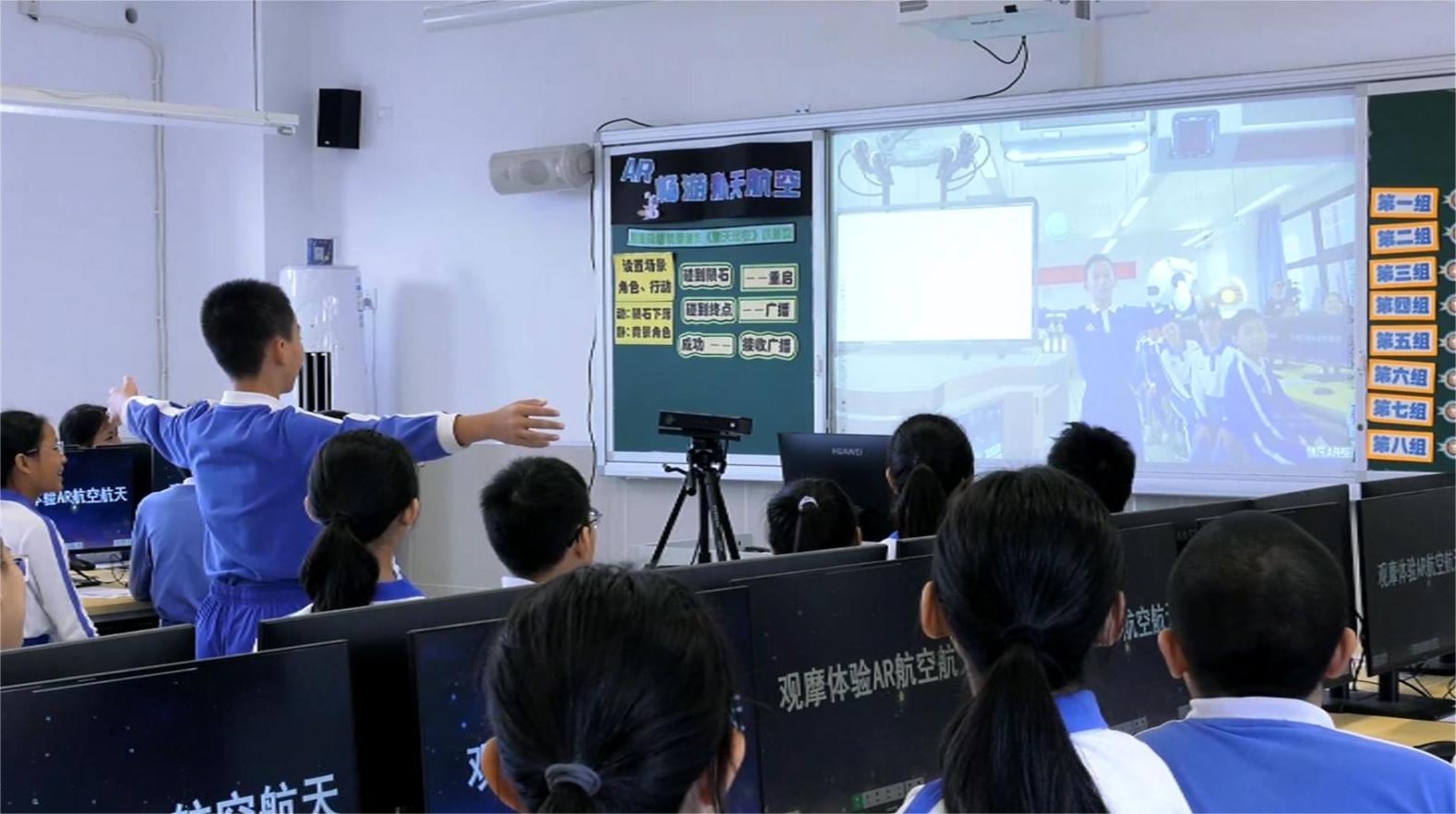 在《逐梦航天》AR大屏互动系列产品中,青少年可以在屏幕前伸开双手,AR变身成为星际“航天员”,体验航天员“同款”太空漫步,了解北斗卫星、天宫系列、长征系列运载火箭等航天重器。