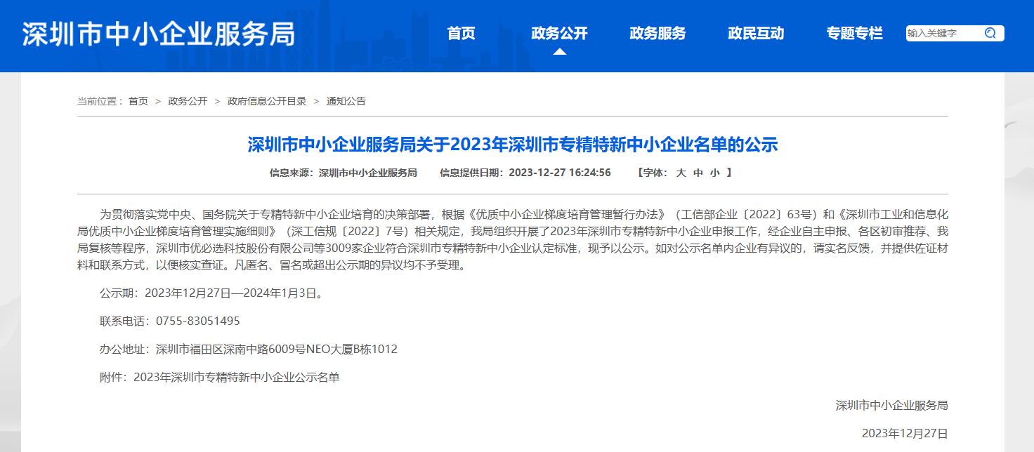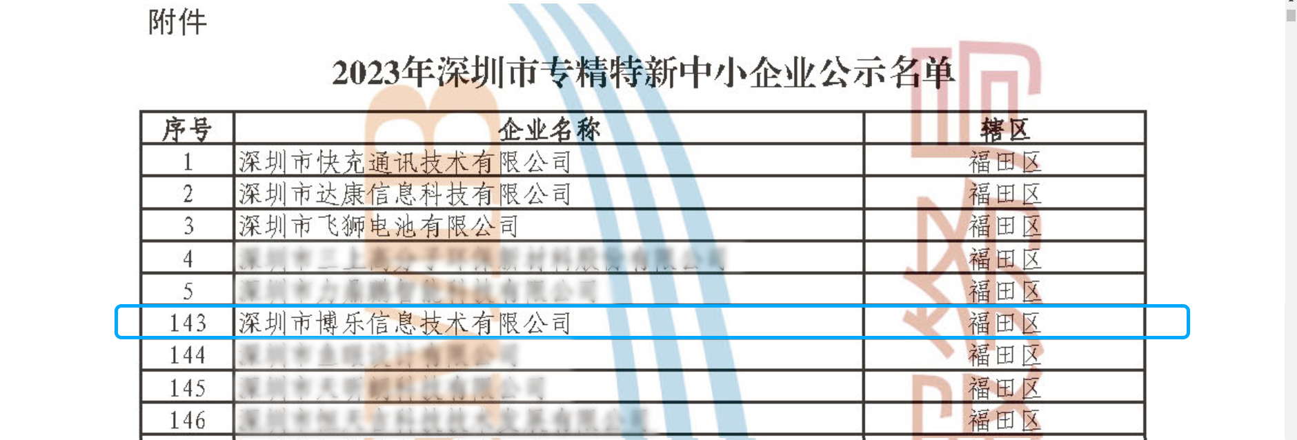 “关于2023年深圳市专精特新中小企业名单”,经过层层角逐,博乐信息荣获深圳市专精特新中小企业认定。
