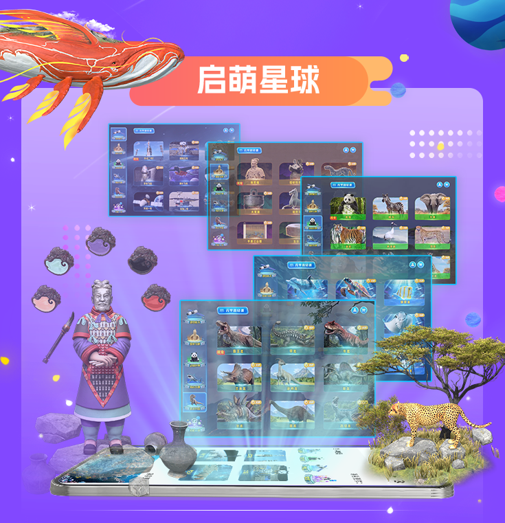 启萌星球:通过iPad或手机即可轻松体验六大主题的AR(增强现实)互动,让知识“活”起来。(逐梦航天、国家宝藏、动物世界、海底奇遇、恐龙帝国、轻松一刻)