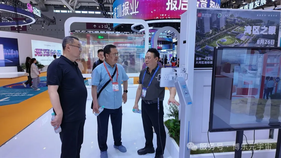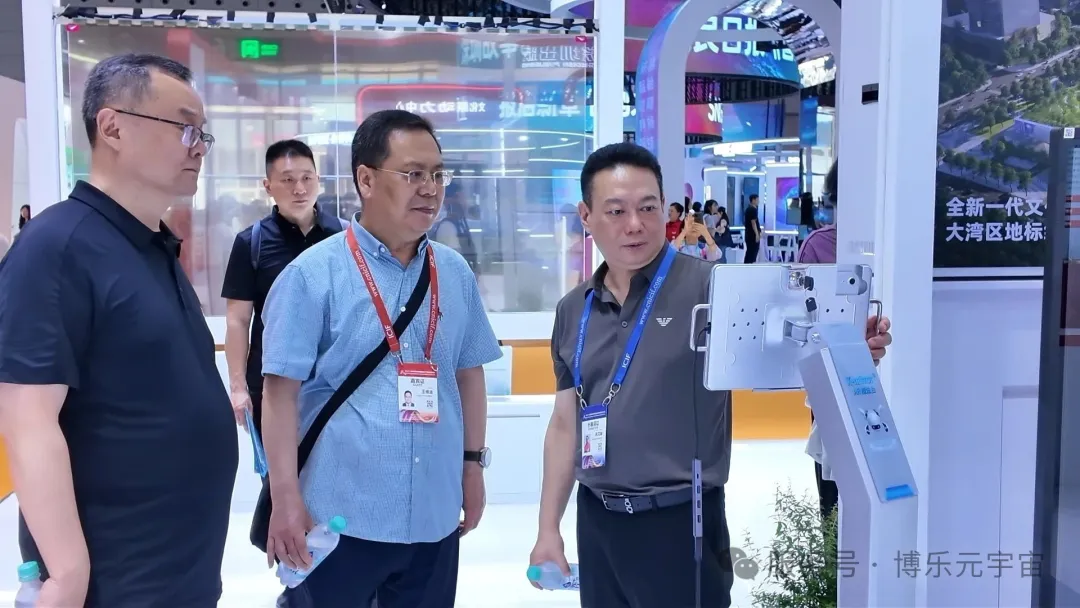 5 月 22 日,深圳博乐信息技术有限公司携 AI+XR 数字交互全场景解决方案重磅亮相 14 号馆,展会期间,王会长与庞董事长一行专程到访博乐展位,体验 X-mirror 全息视界、AI 绘梦绘本、MR 视觉交互打卡点及 AR 魔法台等创新产品。