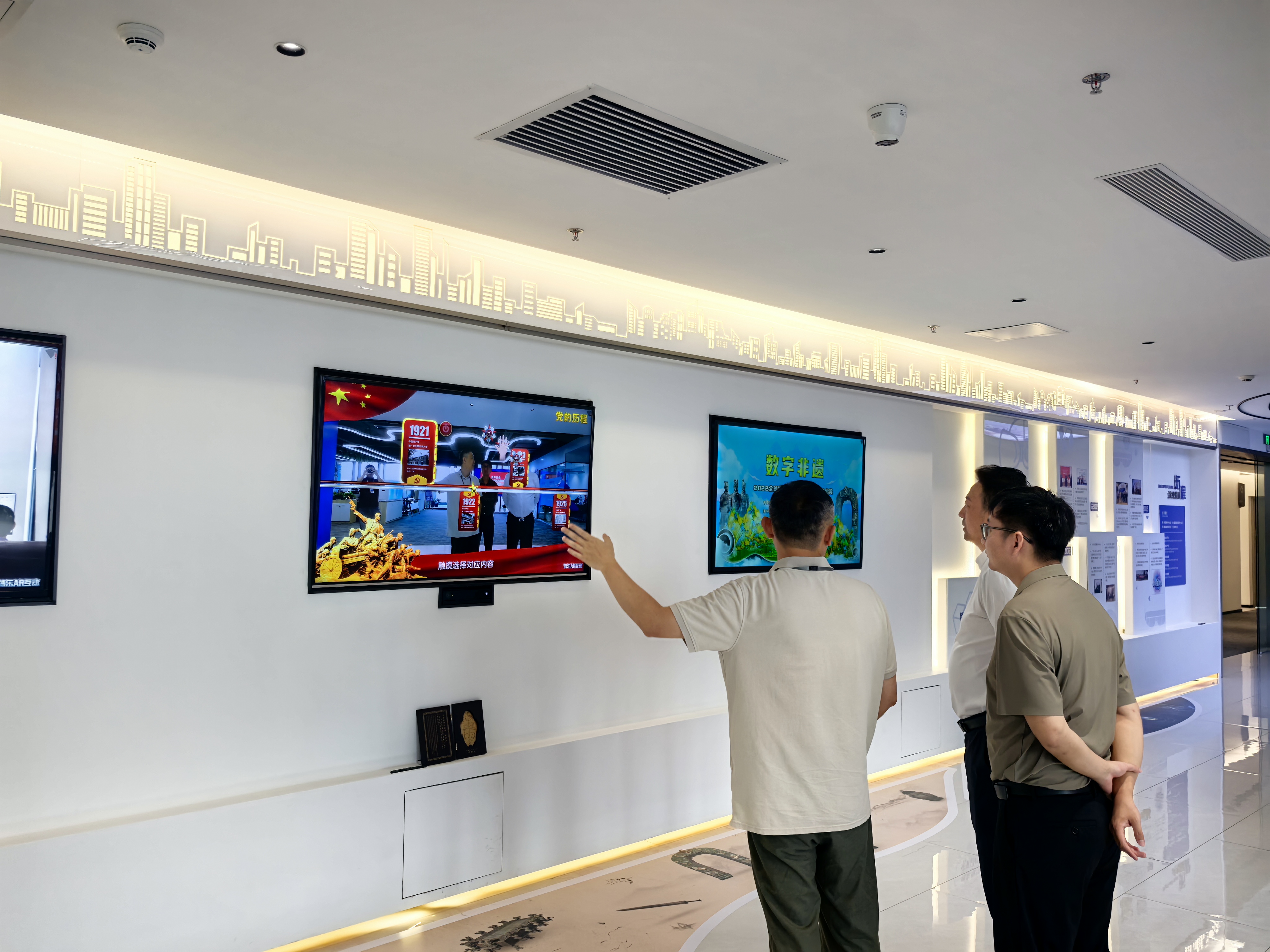 在博乐信息展厅,杨智民会长一行率先体验了党建主题AR大屏互动。通过增强现实、人脸识别与体感追踪等技术,党史故事以动态三维场景实时交互呈现,打破了传统党建教育的单向传播。