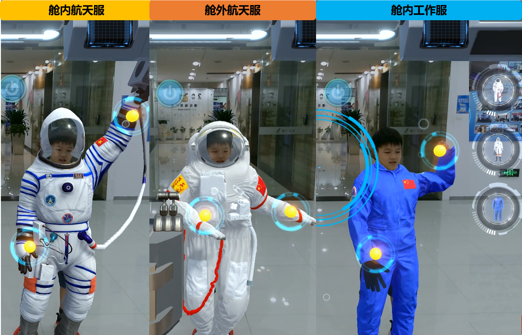 你知道吗?原来宇航服除了不同国家有不同样式外,在不同场所也有专用的航天服。通过这个AR互动,我们可以一次性体验到我国3款不同类型的航天服:1.舱外航天服:航天员走出航天器到舱外作业必穿2.舱内航天服:在航天器内穿戴,航天器发射、返回及在轨运行期间发生密闭舱失压等事故时必穿